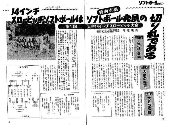 原稿を書いた可部君は、当時東京大学工学部産業機械工学科4年生、その見出しのタイトルは「14インチスローピッチソフトボールはソフトボール発展の切り札である」。第1章は大会の持つ意味、第2章は大会内容、第3章は大会詳報、第4章は大会分析、第5章は14インチスローピッチの発展とその意義でした。特に、第4章の大会分析では、3節に分け、第1節は、試合時間と各選手の運動量(試合時間は約40分だが野手の運動量はファストピッチ以上)、第2節は、高打率と試合の決定要因(全体の半数以上が3割以上で打力が勝敗を分ける)、第3節は、スローピッチファストピッチの比較でした。この分析は見事なもの。彼は私に、卒業論文と同じくらい考え、そして分析しました。と言ってきました。凄い学生がいるな!と私は彼が大学2年生の頃から思っていましたが、まさにこの原稿を読んで、その考えに間違いないことに気付かされました。